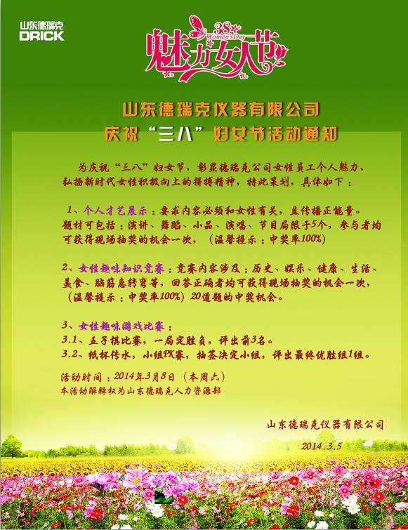 我國(guó)于1949年12月規(guī)定每年的3月8日婦女節(jié),迄今為止已有60多年的歷史,而今年恰逢是三八婦女節(jié)第65周年。為了活躍企業(yè)文化氛圍,表彰和感謝女同胞們?yōu)楣咀龀龅呢暙I(xiàn),山東德瑞克儀器有限公司決定于3月8日為所有女員工準(zhǔn)備了一系列別開(kāi)生面的歡慶活動(dòng),在表彰和感恩的同時(shí)也為德瑞克女同胞們展示個(gè)人才藝,彰顯女性風(fēng)采提供了一個(gè)良好的舞臺(tái)。活動(dòng)具體內(nèi)容如下:
