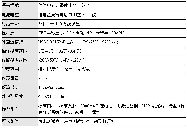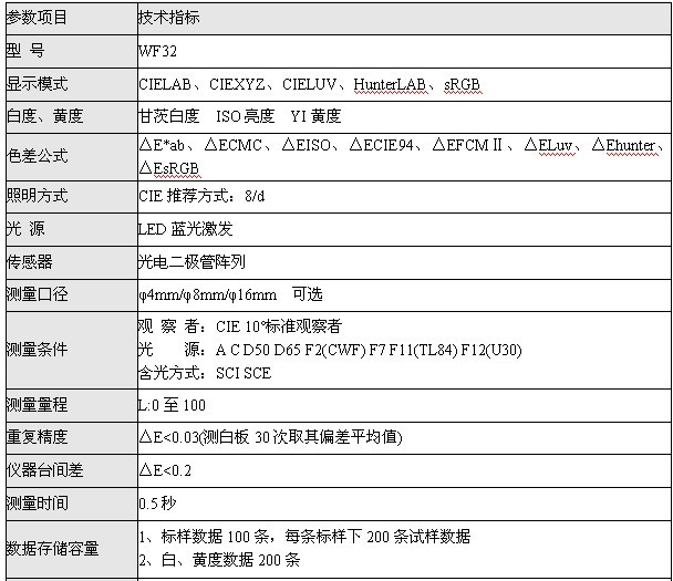 WF32色差儀是一款高精度、高穩(wěn)定性、多功能的色差儀。WF32擁有8種測量光源(A、D50、D65、C、F2、F7、F11和F12);六種顯色模式(CIE1976LAB、CIEXYZ、CIELUV、HunterLAB、sRGB、白黃度);八種色差公式(△E*ab、△ECMC、△EISO、△ECIE94、△EFCMⅡ、△ELuv、△Ehunter、△EsRGB);三種語言模式(簡體中文、繁體中文和英文);有三種測量口徑供用戶選擇。WF32色差儀還能進行白黃度測量和平均測量,有大容量數(shù)據(jù)存儲空間,也可以外接微型打印機進行測量數(shù)據(jù)的實時打印,并能與儀器標(biāo)配的《顏色分析系統(tǒng)》軟件配合使用。